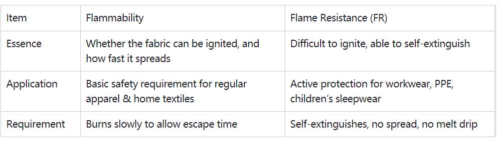 Q1: Are flammability and flame resistance the same thing? A: No. They are completely different concepts. One-sentence summary: Flammability = entry-level safety pass; Flame resistance = advanced per