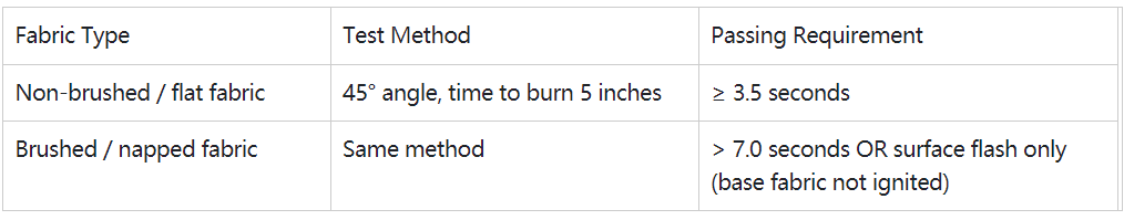 - Children’s apparel (non-sleepwear): same standard, but stricter performance