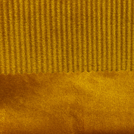 A 510gsm ultra-heavyweight bonded stretch velvet featuring corduroy-style ribbed face and smooth back—engineered for supreme warmth, luxurious softness, and sustainable comfort for extreme cold-weather lounging and elevated casual wear.